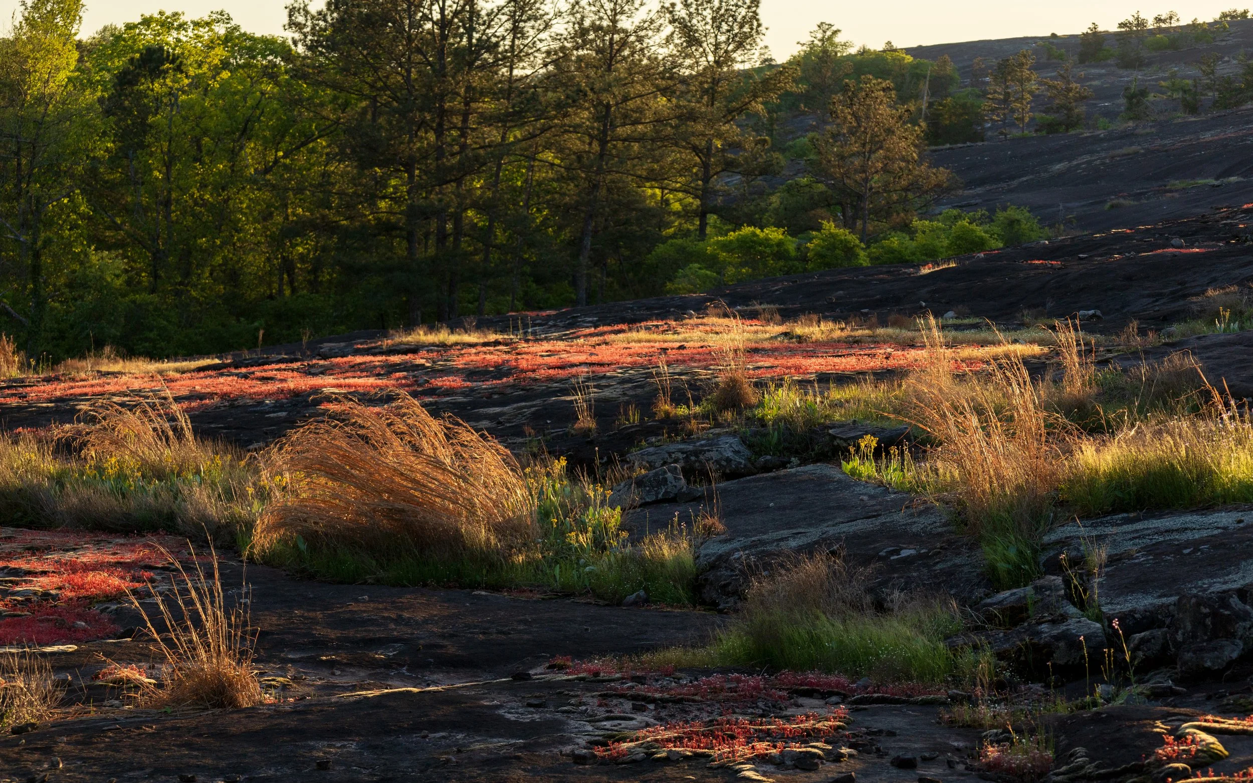 The igneous rock plutons are probably one of the best bets in my area for a landscape photographer, so I ended my time here with an excursion to Arabia Mountain. It’s not as big as the Confederate memorial and I don’t feel like a fat sack of shit hiking to the top of it, but it’s still delightful with it’s wonderful color palette and mozaic patterns where nature crept in between cracks in the stone. Shallow rock pools are occupied with red-bodied little plants tipped with white flowers, green moss and sedge grows in the cracks, and isolated pastures of yellow grass stand where enough debris had collected that their roots could grab a hold of something. And all around, the rocks are streaked with brown, grey, and tan where the draining rain stained it.